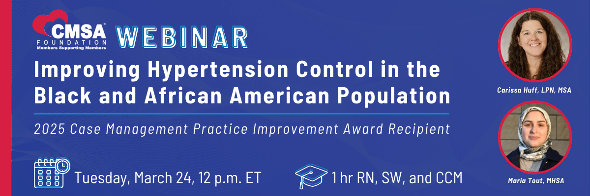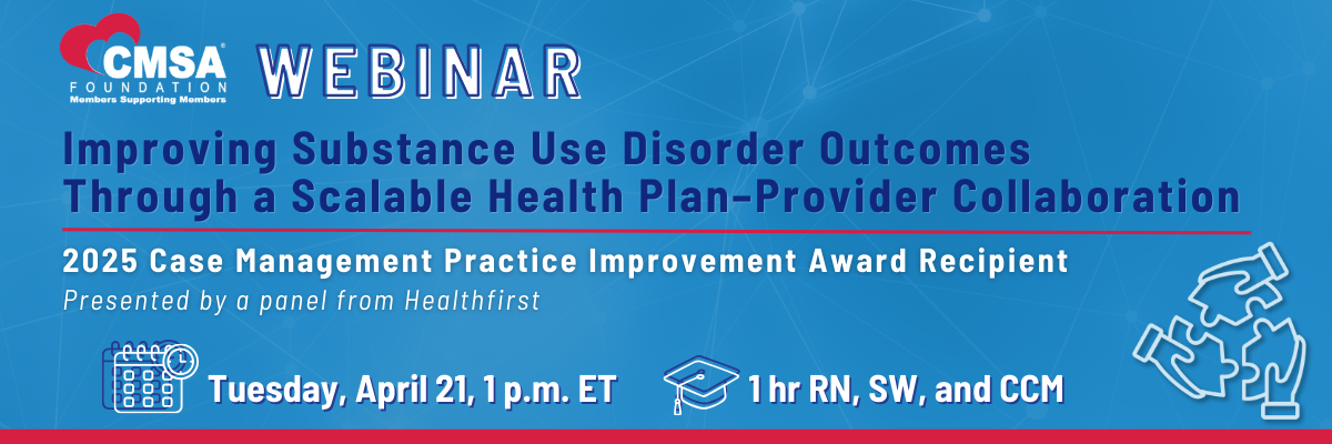 Data-driven insights and evidence-based approaches are shaping the future of case management, refining best practices, and improving patient outcomes. This webinar, hosted by the CMSA Foundation, brings together CMSA Foundation award recipients, alongside key contributors, to explore how research and practice advancements are driving meaningful change in the field. This session will provide attendees with actionable perspectives on leveraging research and data, the benefits of applying for the CMSA Foundation CMPI and Research Awards, and strategies for translating findings into real-world improvements.